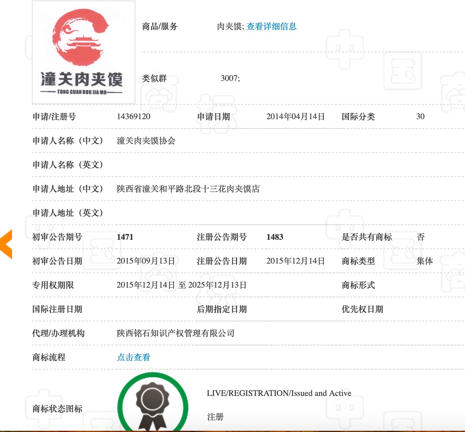潼关肉夹馍集体商标 来源:中国商标网